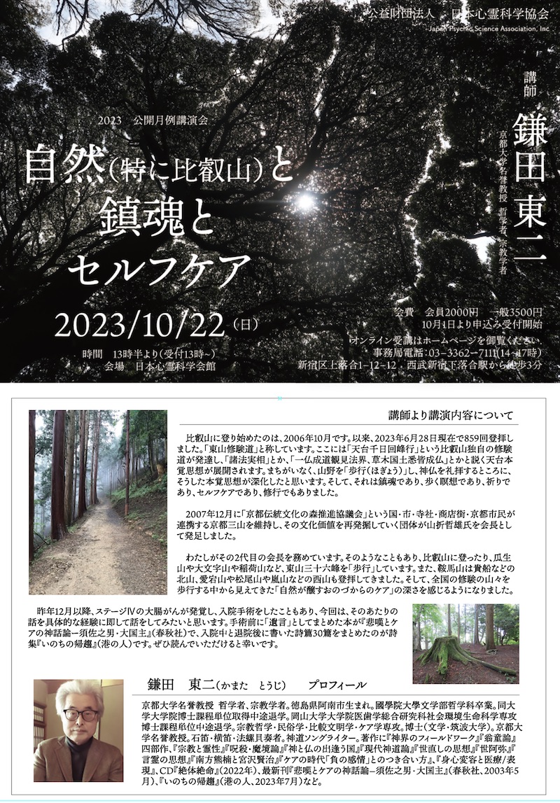 昨年12月以降、ステージⅣの大腸がんが発覚し、入院手術をしたこともあり、今回は、そのあたりの話を具体的な経験に即して話をしてみたいと思います。手術前に「遺言」としてまとめた本が『悲嘆とケアの神話論ー須佐之男・大国主』(春秋社)で、入院中と退院後に書いた詩篇30篇をまとめたのが詩集『いのちの帰趨』(港の人)です。ぜひ読んでいただけると幸いです。