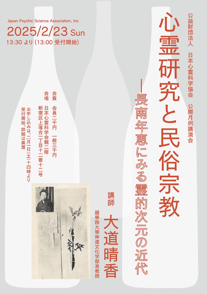 本講演では、山形県庄内地方に根差した民間宗教者にして、心霊研究の文脈で霊媒として名を馳せてきた長南年恵を対象に、「民俗宗教(ローカル)」と「心霊研究(脱ローカル)」という二つの文化の交流に着目することで、近代以降の日本社会における霊的次元の在り方を探ってみたいと思います。