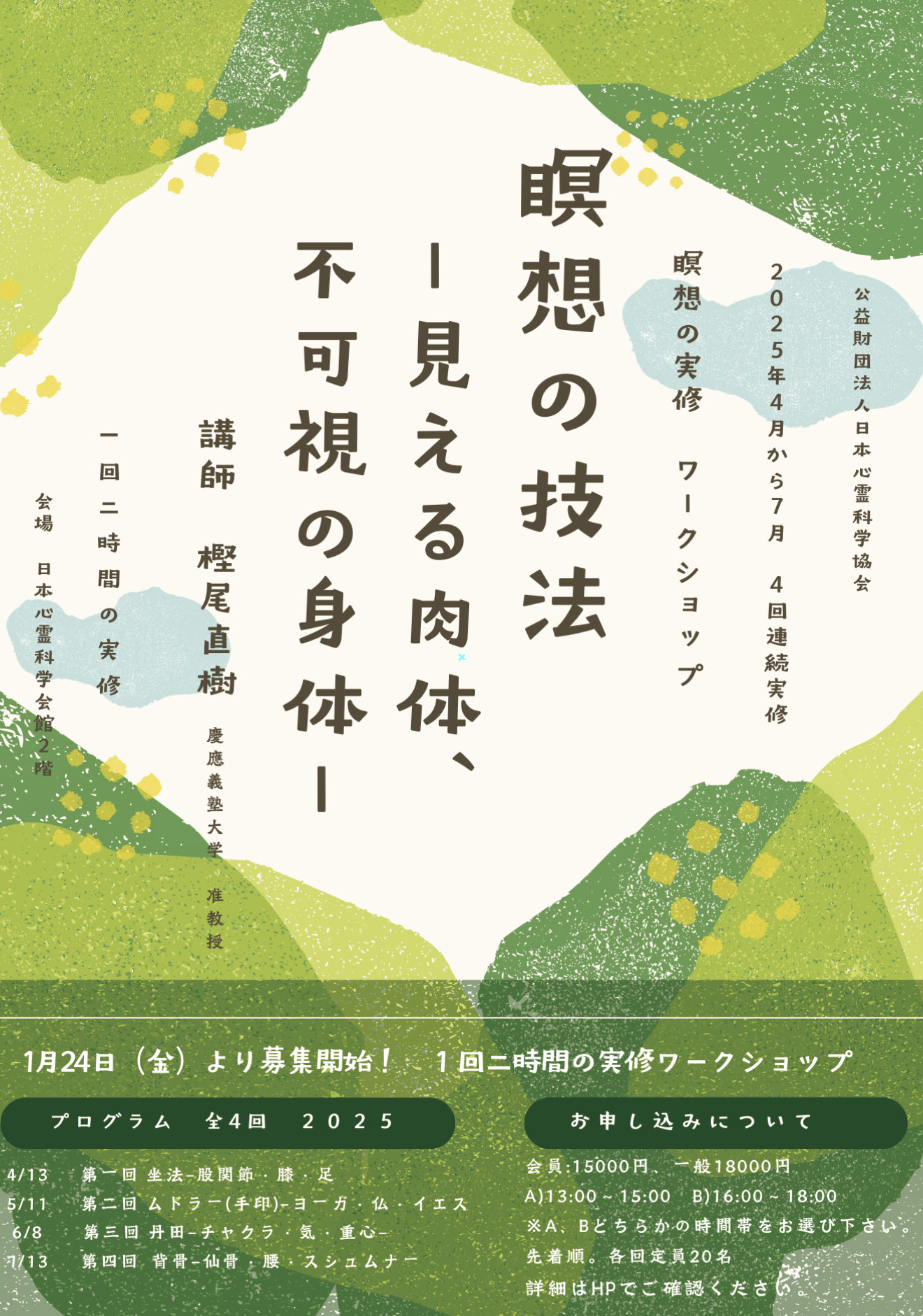 2025 年度では、それを受けて、受講者からの要望もあり、よりインテンシブな瞑想の実修 ワークショップを実施したい。具体的には、坐法、ムドラー(手印)、丹田、背骨という瞑想実践の基盤となる身体部位/体位および丹田・チャクラ・経絡という不可視の身体にフォ ーカスし、サマタ瞑想(坐禅)とヴィパッサナー瞑想を行う。できるかぎり参加者おひとり おひとりの身心状態に寄り添いながら、疑問・質問に丁寧に対応し、瞑想の根本技法につい てお伝えしたい。