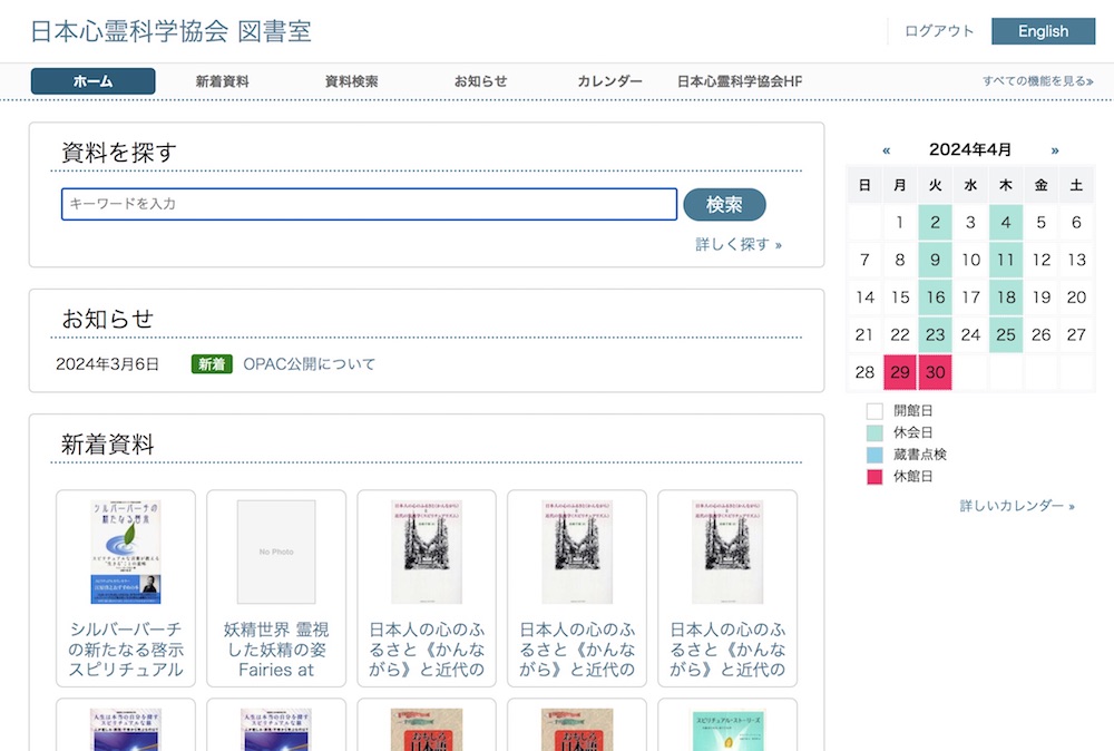 OPAC検索システムを公開しております。図書の貸し出し、閲覧室の利用を希望される方は、図書室利用カードの申請をお願いします。申請に関する必要書類、詳細については、図書室 を参照してください。